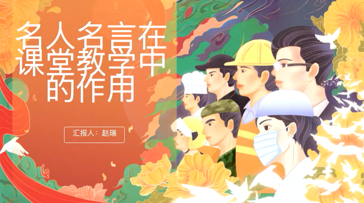 赵瑞老师的分享题目是《名人名言在课堂教学中的作用》。名言警句是先辈们在长期生活实践中总结出的宝贵经验,是民族文化的瑰宝与财富。所谓“读书百遍,其义自见”,若能引导学生对名句深入研读、体会与补充,学生的素养自然能够得到提升。赵瑞老师认为在课堂中运用名人名言,不断增强课堂教学的感染力,提升课堂教学效果。