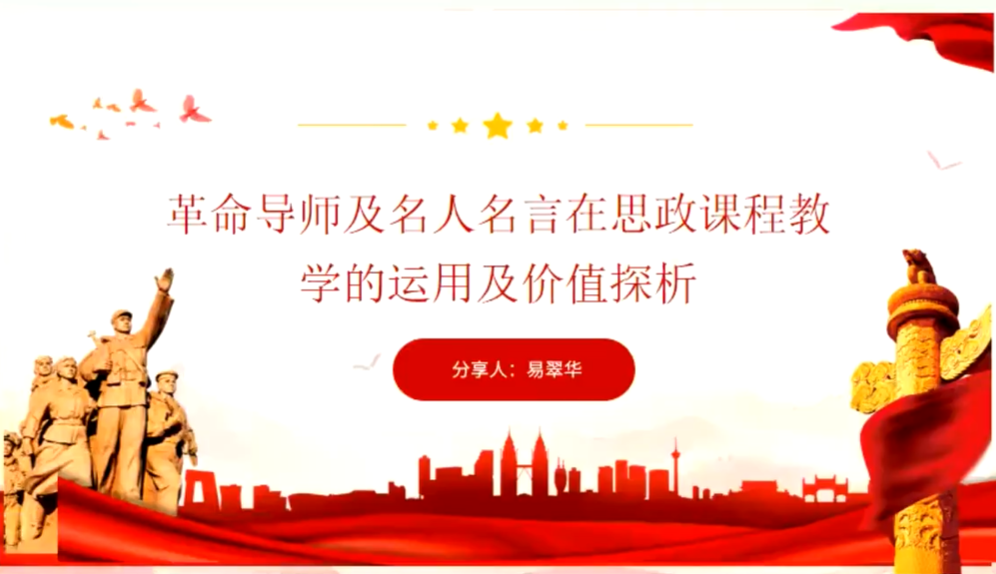 易翠华老师则以《革命导师及名人名言在思政课程教学的运用及价值探析——以习近平新时代中国特色社会主义思想概论课程为例》为题进行理论分享。易翠华老师采用理论分析与案例研究相结合的方法,揭示革命导师及名人名言在思政教学中对于增强理论说服力、提升教学感染力、培养学生正确价值观的重要作用,旨在为思政课程教学质量的提升提供理论参考与实践指导。