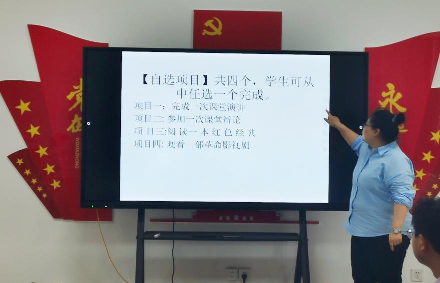 方瑾毅、马迎玉、罗丽梅老师就本学期的实践活动进行分享展示交流。方瑾毅老师展示了四个自选项目并进行了教学说明。她要求学生可从一次课堂演讲、一次课堂辩论、一本红色经典、一部革命影视剧中任选一个完成,并进行指导,完成教学任务。马迎玉老师结合《史纲》课程选取重大历史事件或红色英雄人物事迹,以红色文艺汇演的形式在课堂上呈现作品。活动以生动直观的形式将经典红色作品演绎出来,从而使学生更真切地感受革命年代的精神风貌,使红色基因得以传承和弘扬。罗丽梅老师的研读观感类活动,通过集体观看纪录片《走进毛泽东》,探讨毛泽东同志的革命实践和思想精髓,让学生追寻红色记忆的同时,传承红色基因,成果以手抄报形式呈现,传播红色文化。