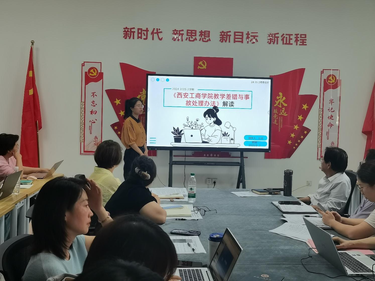 陈妍老师结合《西安工商学院教学差错和教学事故认定及处理办法(修订)》文件精神,从考试组织、监考职责、纪律要求等方面展开培训。她重点解读了考试与成绩管理类差错(B 类)及事故(B 类)的认定标准,强调监考人员需严格遵守时间规定,提前 5 分钟到达考场,避免出现迟到、擅离职守等情况。