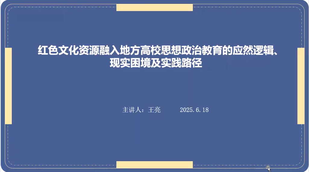 王亮老师分享了红色文化资源融入地方高校思想政治教育的逻辑、现实困境及实践路径,强调挖掘和运用好红色文化资源,使其成为涵养学生品格坚定理想信念的活教材。