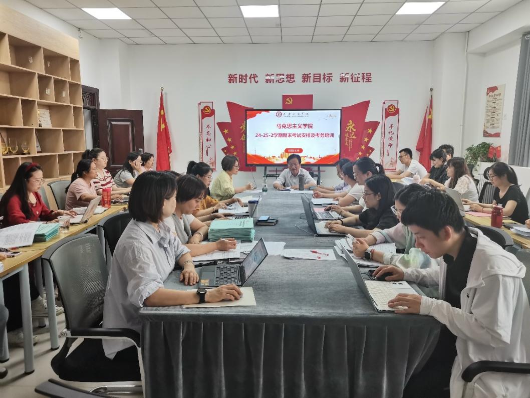 为严格落实学校教学管理要求,规范期末考试组织流程,严肃考风考纪,马克思主义学院于 2025 年 6 月 18 日14:30在1-402会议室召开 2025 年春季学期期末考试考前部署暨考务培训会。会议由逯爽老师和陈妍老师主讲,马克思主义学院全体教师参会。